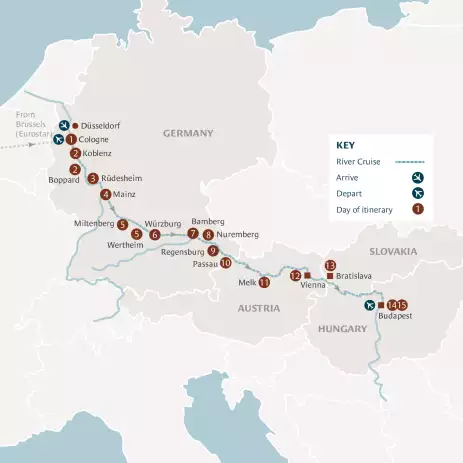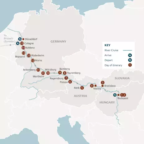 Experience a variety of medieval towns and imperial cities, from quintessential Bamberg to classical Vienna, and cruise through the dramatic scenery of the Rhine Gorge. This fifteen-day river cruise takes you on a journey from Cologne in the heart of the Rhine Valley to Budapest on the banks of the Danube.