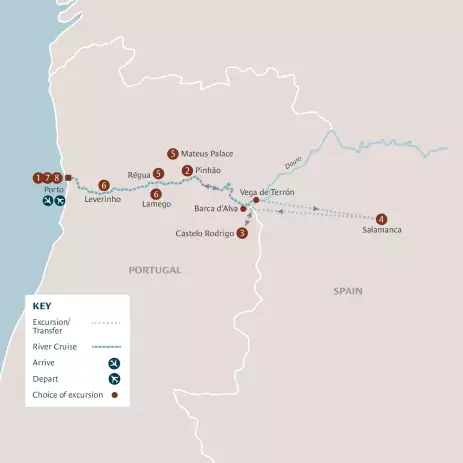 Commencing in the Roman city of Porto, the home of Port wine, Portugal’s once wild river Douro has been tamed by locks into resembling a series of finger lakes, adding greatly to the valley's ambience. Leaving behind the Atlantic influenced greenery of the coast, you are soon immersed in a Mediterranean land of olives, vines, and picturesque, medieval hilltop villages.