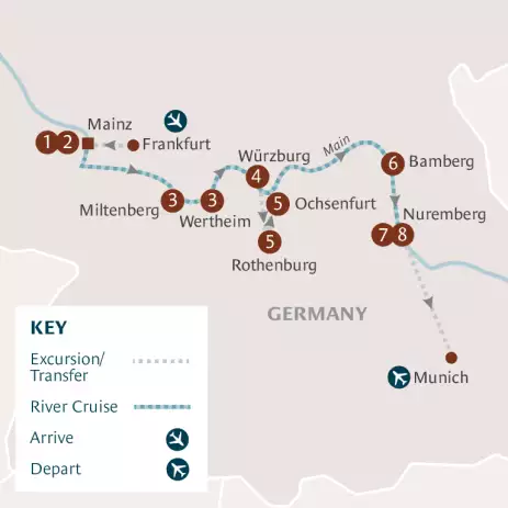 Explore Medieval Germany in its purest form, cruise the Main and the Main-Danube-canal, discovering the Romantic Road, the streets of medieval Bamberg, enchanting Rothenburg and fascinating Nuremberg.