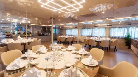 Enjoy a fabulous dining experience in the sleek and serene main restaurant, complete with a connecting al fresco area to savour the sea breeze. Start your day with a fulfilling breakfast, featuring a corner buffet table with hot and cold dishes. At lunch and dinner, indulge in Mediterranean salads and well-prepared meals, with a special "Captain's Dinner" offering carefully selected dishes.