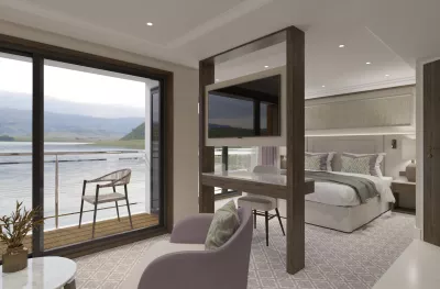 Experience our biggest cabin, the spacious Grand Suites, featuring floor-to-ceiling windows and a private balcony with stunning views. Enjoy a king-sized bed and separate living area.